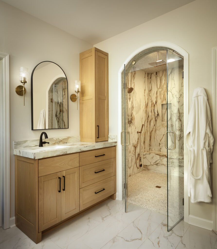 A beautiful primary bathroom renovation featuring Macchia Vecchia Marble.
