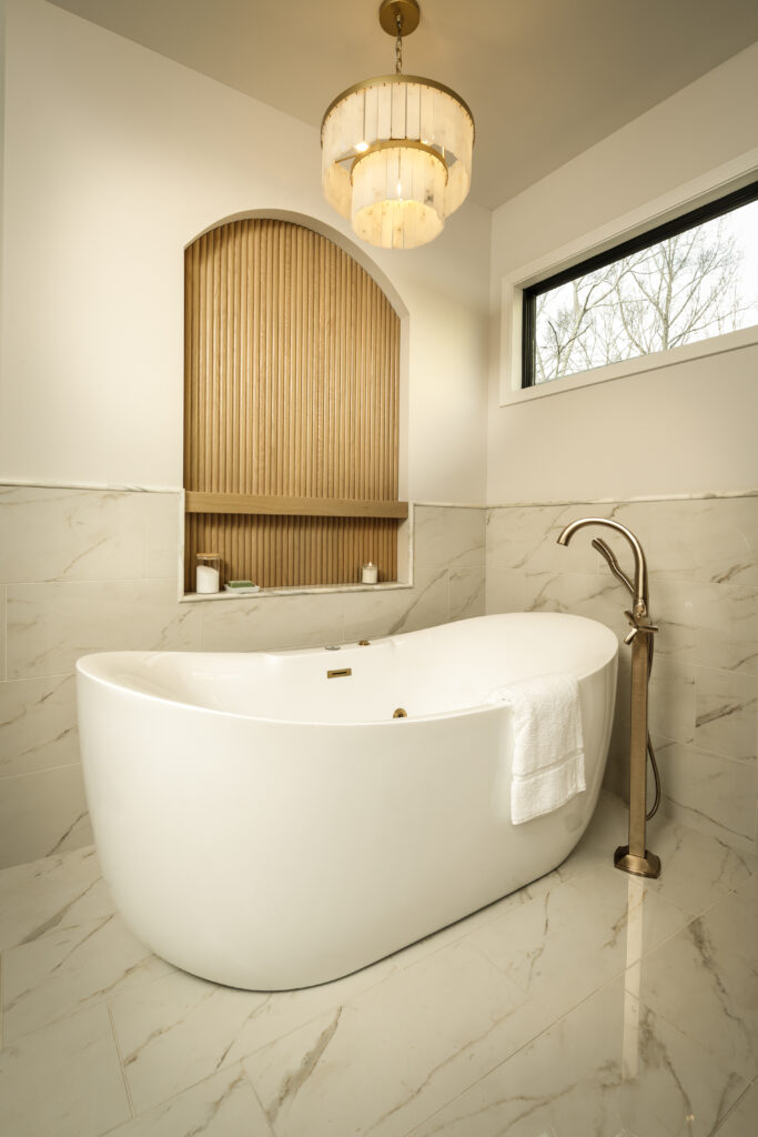 modern bathroom with gray cabinets, free standing bathtub and marble tile floor